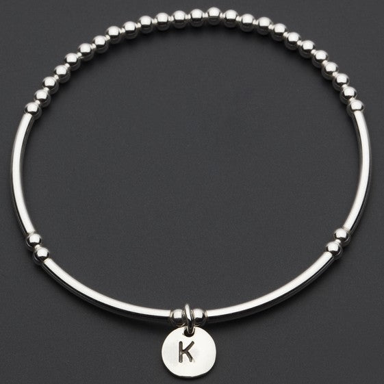 Our Love Letters collection showcases a range of stunning sterling silver bracelets on elastic, each with its own delicate disc charm. A, B, C, D... pick & choose which initial is significant to you!