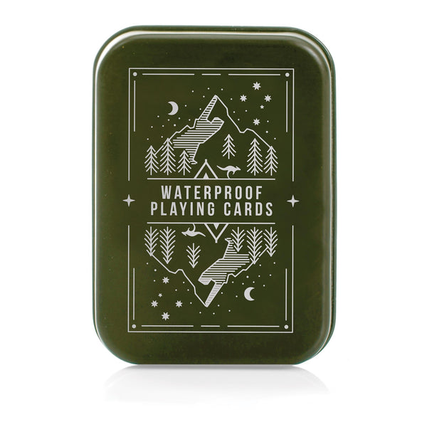 The cards are metallic silver with an Aussie outdoor adventure image on the reverse and they come stored in a camo green tin for gifting and keeping them on you at all times.