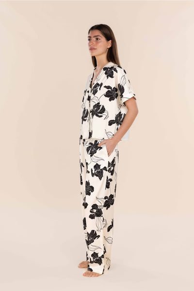 Elevate your sleepwear with the Wren Recycled Silky Satin Floral PJ Set in timeless black and white. Featuring a graceful floral print and crafted from recycled silky satin, this women’s pyjama set is both eco-friendly and luxurious. The relaxed-fit button-through shirt offers a refined finish that transitions effortlessly from bed to brunch. Paired with wide-leg pants featuring a soft elastic waistband, adjustable drawstring, and convenient side pockets, this set is designed for optimal comfort, movement, and modern style. Sustainable sleepwear has never looked this good. Comes in a luxurious gift box.