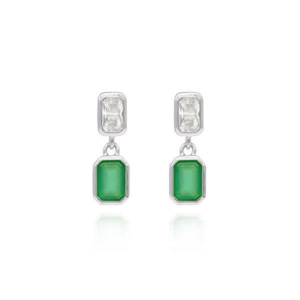 The Gemme Calibri Drop Earrings feature a green onyx & lab-grown white sapphire.