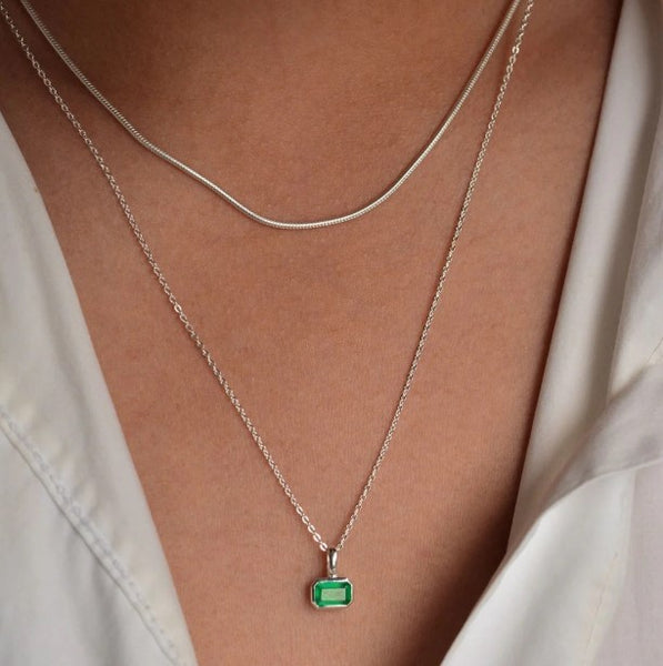 Our Gemme Pendant set with a natural green onyx on a cable chain.