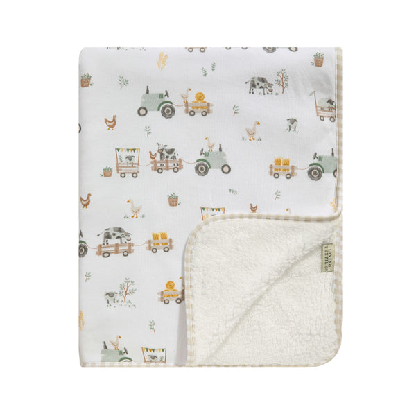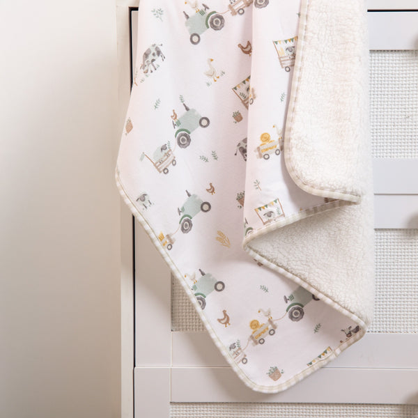 Crafted from 100% Organic Cotton Interlock Jersey and backed with plush sherpa, this pram blanket is perfect for keeping baby warm on the go.