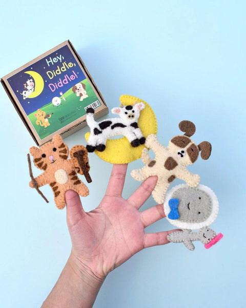 Step into a whimsical world with our Hey Diddle Diddle Finger Puppet Set, ethically handcrafted to enhance storytelling. This delightful set features the cherished characters from the classic nursery rhyme: the cat with his fiddle, the cow that jumped over the moon, the little dog laughing to see such fun, and the dish running away with the spoon.