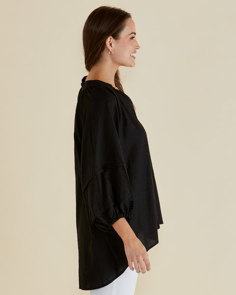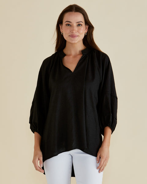 Crafted from a breathable viscose/linen blend, the Grazia Blouse features an open V-neckline with a delicate tie neck detail. Long balloon sleeves with elasticated cuffs add an elevated, classic charm. Its oversized fit offers comfortable, effortless transeasonal elegance perfect for polished styling.