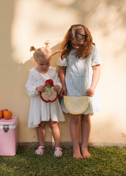 Sweet and summery, this adorable watermelon straw bag is perfect for little ones who love to carry their treasures in style! Made from 100% raffia straw, it features a fun watermelon design, comfortable crossbody straps, and a secure zip closure. The inside is lined with a soft, tonal-coloured fabric to keep belongings safe.