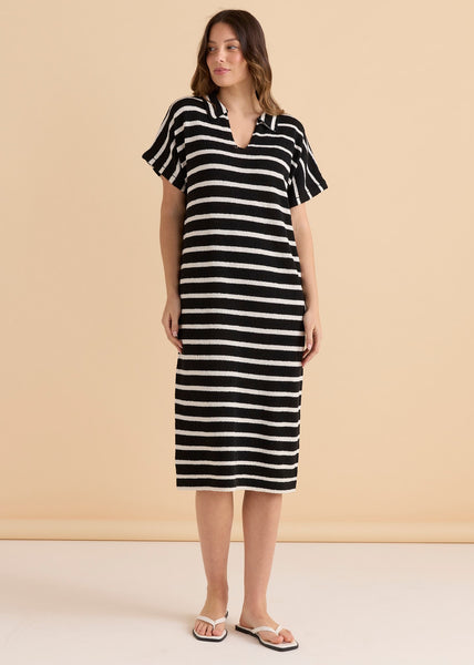 An easy everyday dress designed in a soft, breathable knit for all-day comfort. The split neckline with collar detail adds a polished touch. Finished with a classic stripe pattern for transeasonal appeal. A relaxed silhouette that keeps dressing simple and elevated.