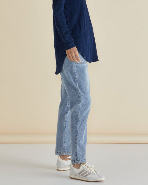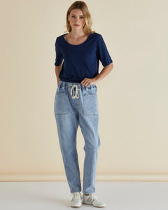 The Haven Straight Leg Jean is designed for comfort and style, featuring an elasticated waist, drop-crotch, and functional pockets. The drawcord allows for a customized fit, while the mid-high rise and straight leg offer a relaxed yet flattering silhouette. Perfect for casual days or relaxed outings, these jeans are a versatile wardrobe essential.