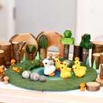 Inspired by my child's favourite nursery rhyme "5 Little Ducks", this duck pond play mat consists of Mother Duck and 5 little yellow ducklings. Our duck pond play mat is decorated with felt stones, yellow flowers and beautiful felt grass handmade from merino wool. The ducks have been meticulously needle-felted and can be moved around the playscape.